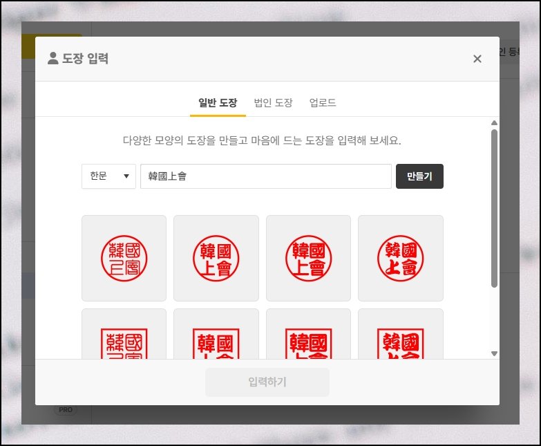 도장 생성 팝업이 나타나면 개인용과 기업용 중 원하는 쪽을 고릅니다. 좌측 드롭다운에서 한글 옵션을 지정해 주세요. 업체명이나 직책 등 원하는 텍스트를 적어 넣고 생성 버튼을 탭하면 여러 디자인의 직인이 표시되니 선택하면 됩니다.