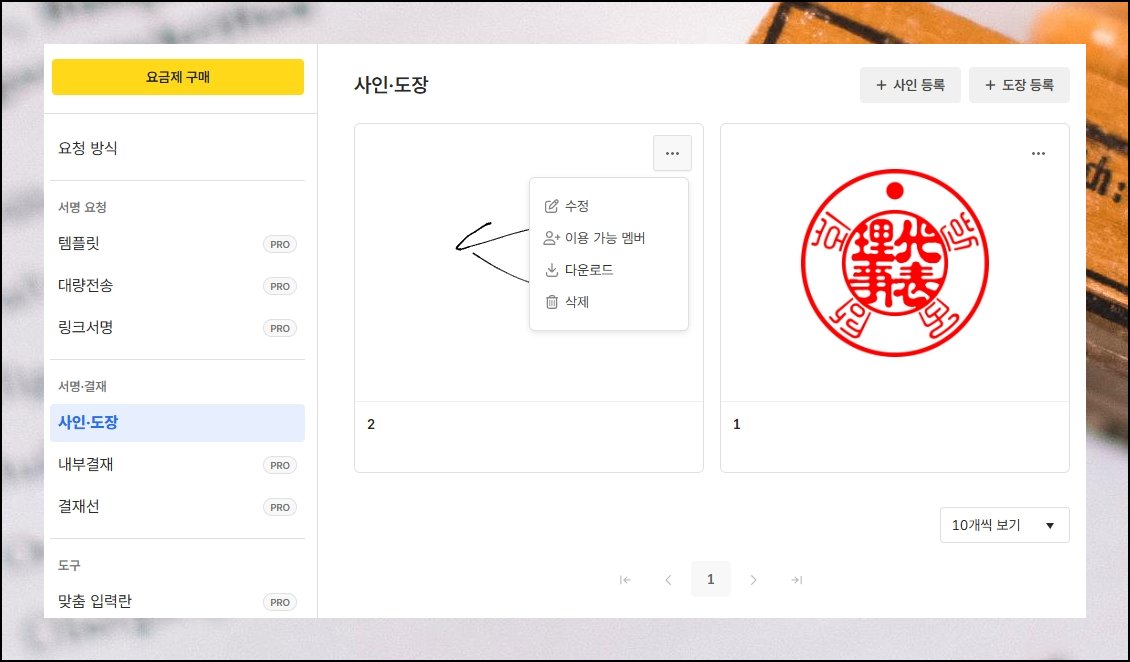 접속을 마치면 개인 관리 화면이 열립니다. 계약 서류를 정리하거나 보내고 새로 작성하는 것이 가능해요. 화면 좌측 탭에서 서명 및 도장 관련 항목이 보입니다. 그 안에서 새 인장을 추가하는 버튼을 찾을 수 있습니다.