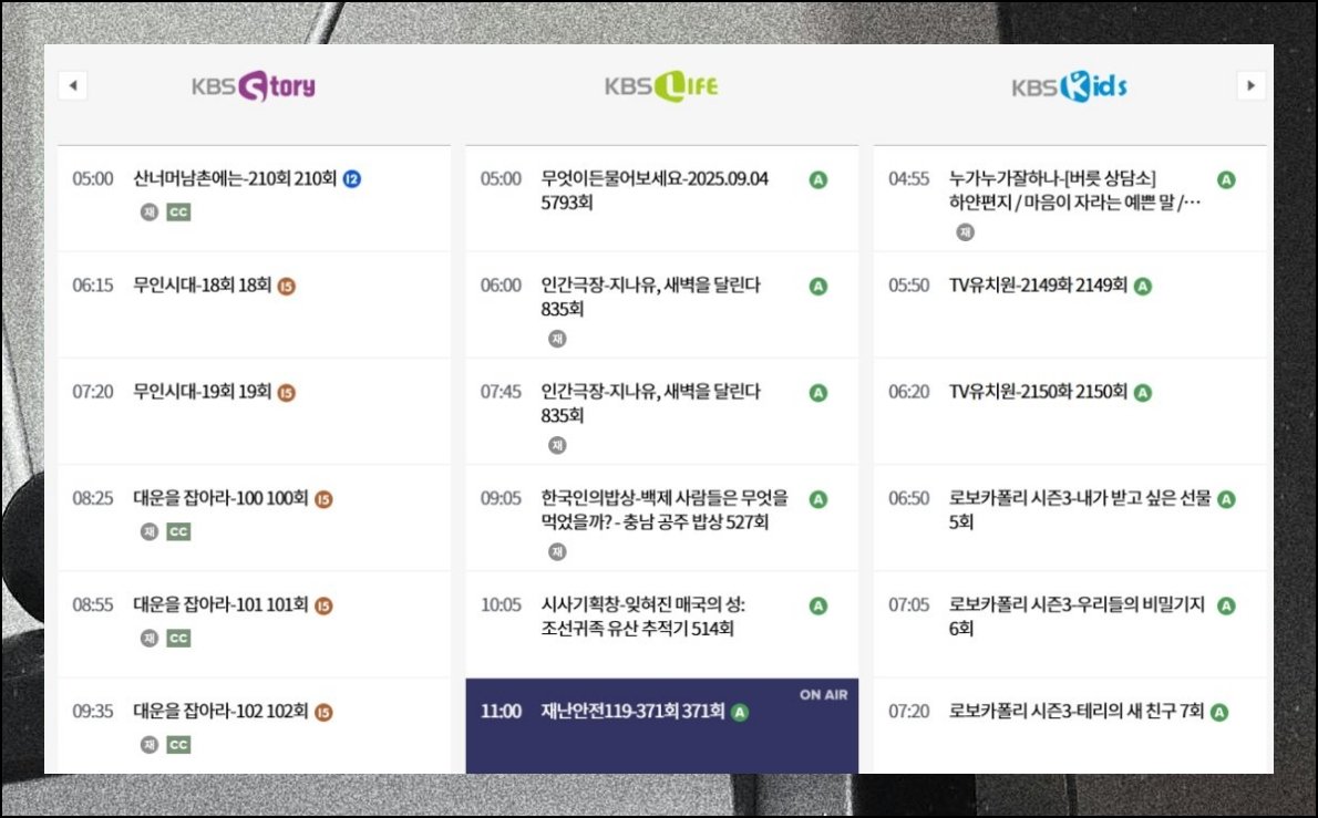 영상 화면 우측 아래 편성표 버튼을 눌러 보세요. kbs실시간 방송보기 일정이 시간별로 정리되어 있거든요. 놓치기 싫은 콘텐츠가 있다면 사전에 스케줄을 훑어보는 편이 효율적입니다.