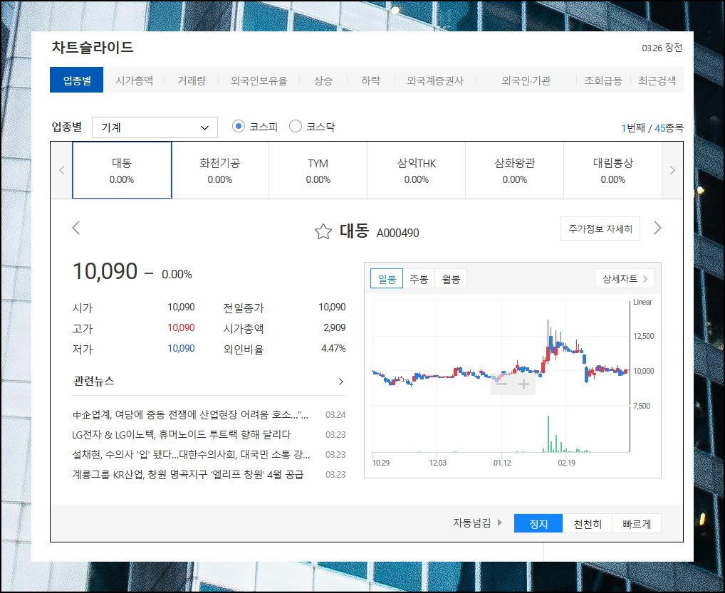 다음증권 종목 현황 페이지에서 슬라이드 전환 버튼을 선택해보세요. 성격이 유사한 항목끼리 자동으로 묶여 돌아가며 나타납니다. 같은 분야별 나열은 기본이고 기업 규모나 체결량 순서로도 재배열이 돼요. 가격 추이와 해당 기업 소식 그리고 그래프까지 단일 창 안에서 종합적으로 살펴볼 수 있습니다.