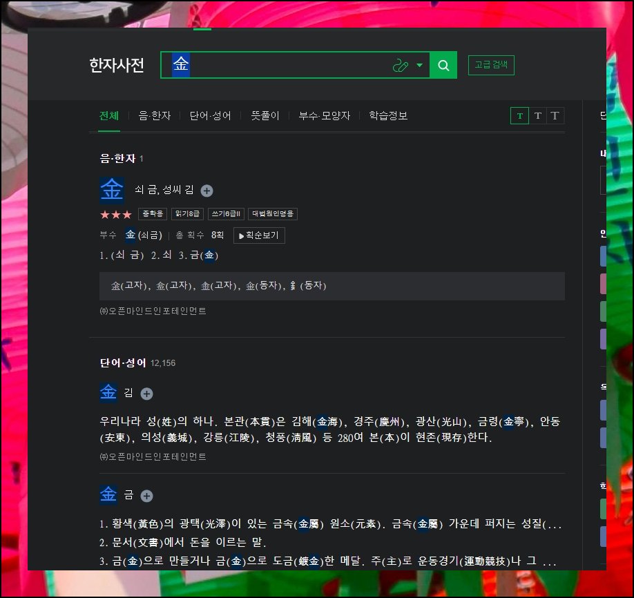 성을 나타낼 때는 김, 금속을 뜻할 때는 금으로 소리 나는 한자를 실제로 시험해 봤습니다. 부수, 전체 획수, 필순, 학습 등급 등 기본 데이터가 곧바로 표시돼요. 복수의 해석이 동시에 제공되기도 합니다. 단순히 써서 스케치한 것만으로 이토록 촘촘한 내용을 확보할 수 있다니 활용 가치가 높아요.