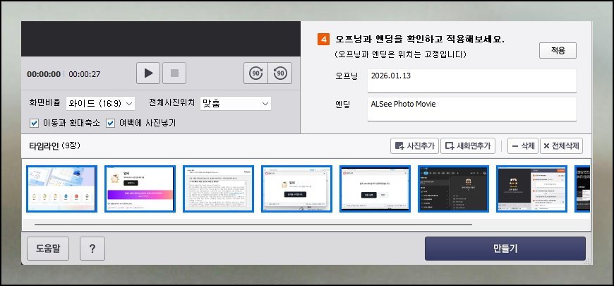 동영상 만들기가 까다롭다고 생각하기 쉬운데 직접 해보면 생각보다 쉽습니다. 알씨 프로그램 하나만 갖추면 관련 지식이 부족해도 괜찮은 결과물을 뽑아낼 수 있어요. 작업 전에 이미지와 삽입할 배경 음악부터 마련해두세요. 슬라이드별 노출 시간을 어느 정도로 잡을지 구상해두면 진행이 매끄럽습니다. 여기에 글자와 화면 효과를 덧붙이면 퀄리티가 눈에 띄게 달라져요.