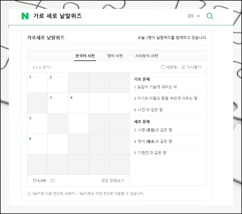 네이버표 게임은 어렵기 정도와 다루는 영역이 매우 다채로워요. 자그마한 5x5 판부터 묵직한 10x10 판까지 본인 솜씨에 맞춰 고를 수 있습니다. 사전 세 종을 근거로 만들어진 문항이라 폭넓은 분야의 지식을 두루 만나봅니다. 입력은 마우스 클릭으로도 되고, Tab 키를 눌러 칸 사이를 옮겨 다닐 수도 있어요.
