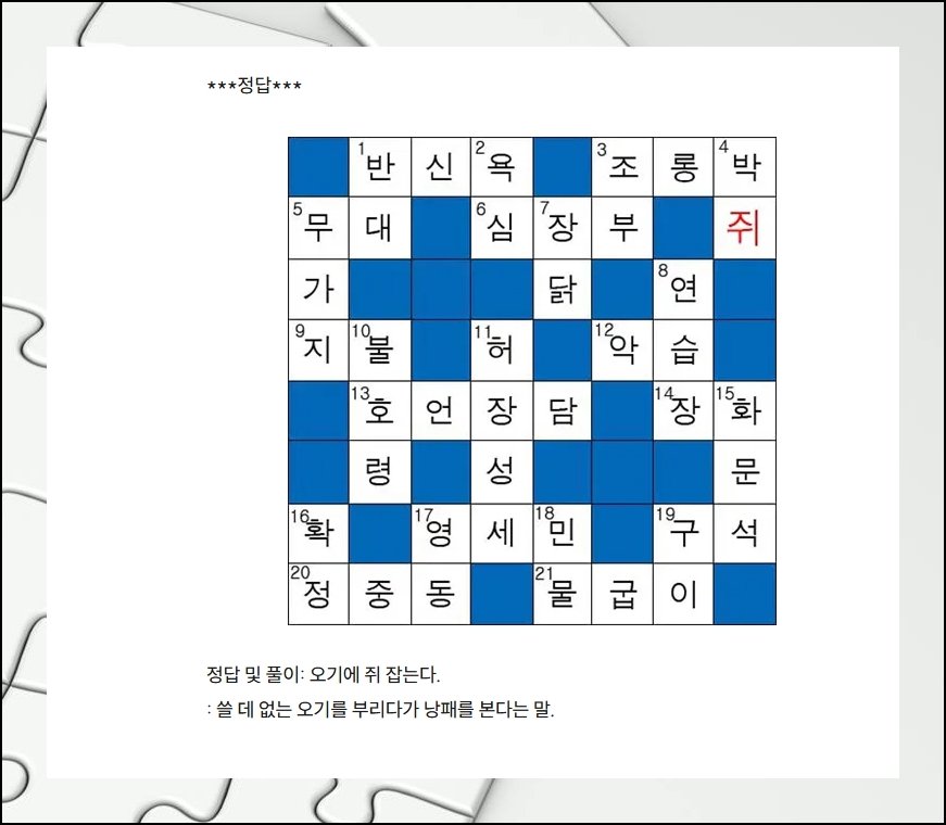 방금 안내해드린 가로세로 낱말 퀴즈는 배움과 놀이가 알맞게 어우러진 퍼즐이에요. 교육적인 무게도 충분해서 자녀가 즐기기에도 더없이 좋은 활동이지요. 머리를 굴리는 훈련이 자연스럽게 이어지고, 신명 나게 풀어가는 사이 아는 것의 폭이 차곡차곡 넓어집니다.